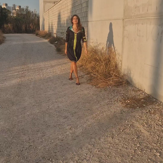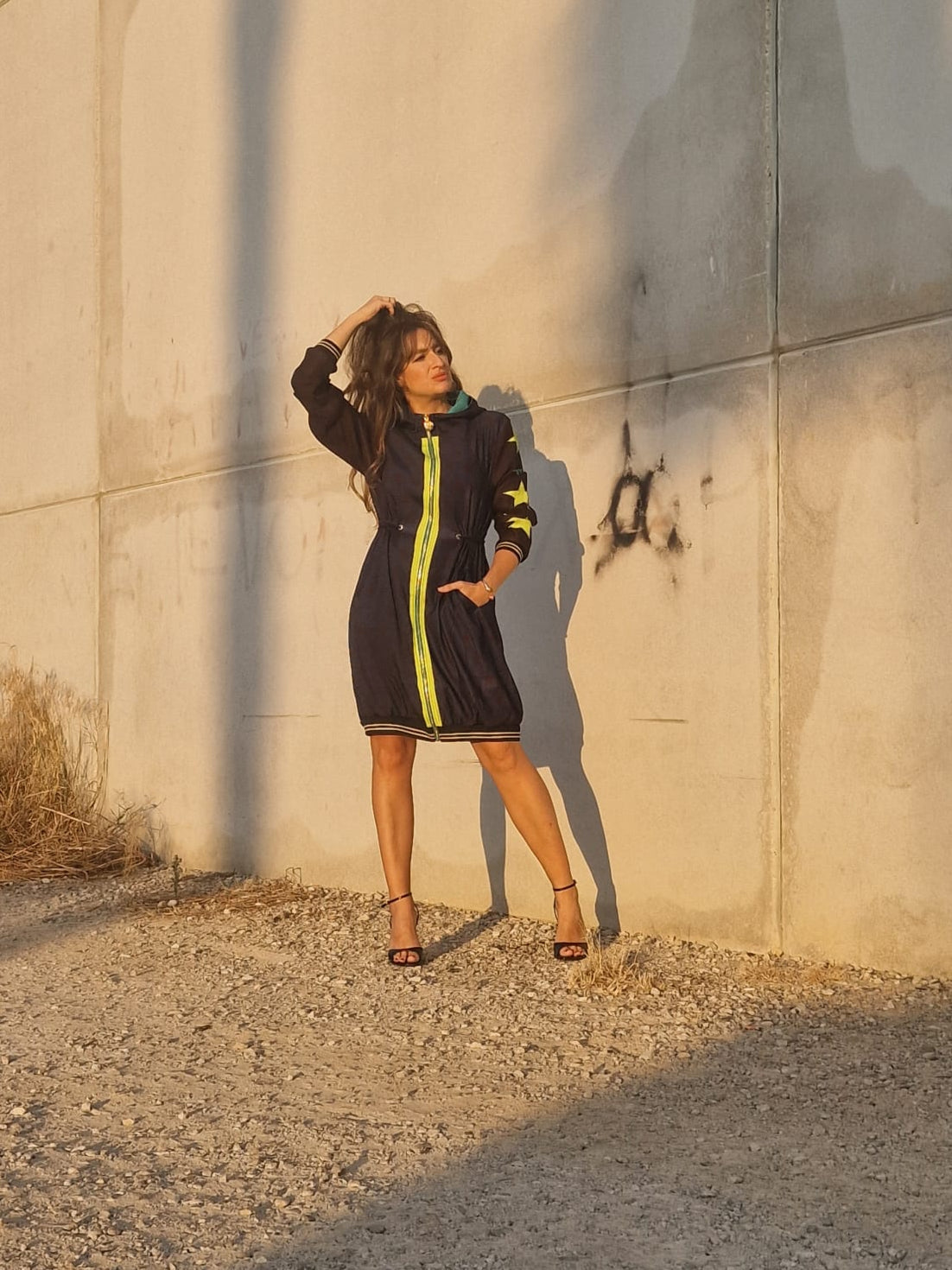 Os presentamos este VESTIDO CHAQUETA creado y elaborado con tejido técnico, el cual repele el agua y la humedad, sin ser un chubasquero.