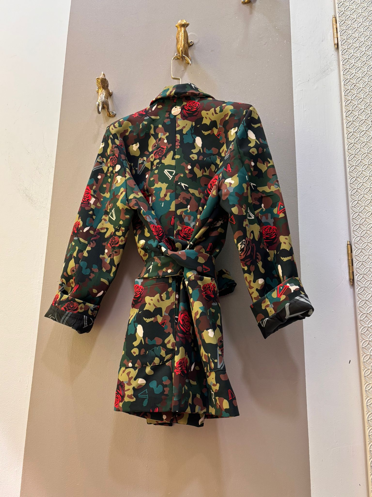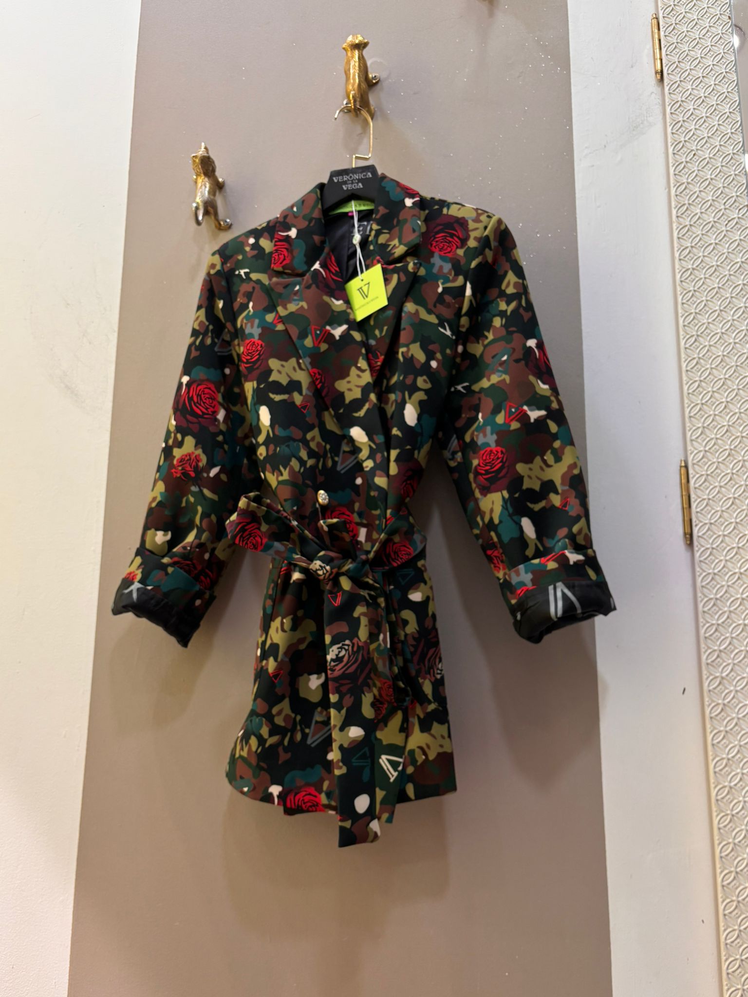 Blazer de corte recto y tendencia masculina creada por Verónica de la Vega con hombreras saliente y cinturón para ajustar.